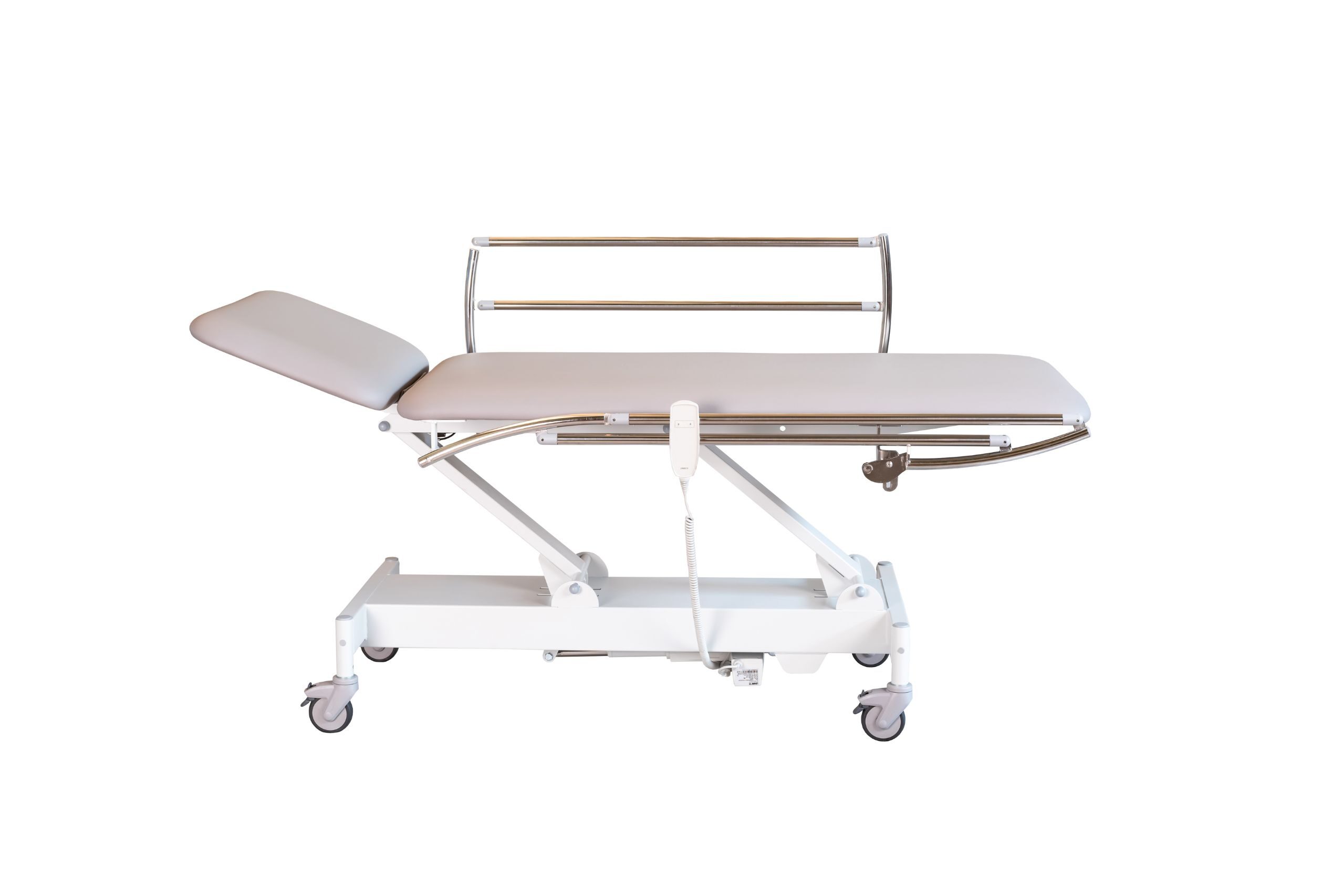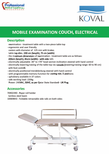 The KOVAL Mobile Examination Couch is an ergonomic and user-friendly treatment table designed with a two-piece table top to facilitate various medical examinations. It offers a sophisticated electrical adjustment system, allowing for precise positioning with a head section inclination ranging from -30° to +70° steered via hand control. The table top height is electronically adjustable from 60 to 90 cm using a convenient foot control console.