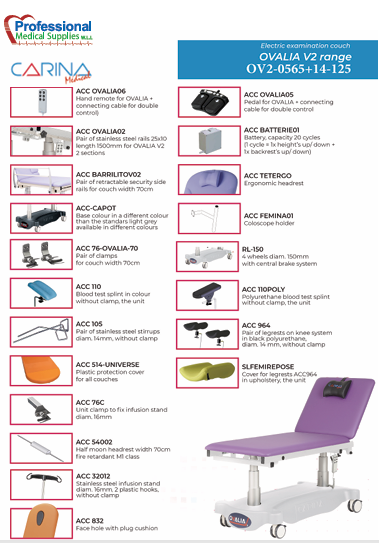 The OVALIA V2 electric examination couch is a professional medical table designed for clinical use, offering comfort, durability, and flexibility. It comes with a wide range of compatible accessories to support various medical procedures.
